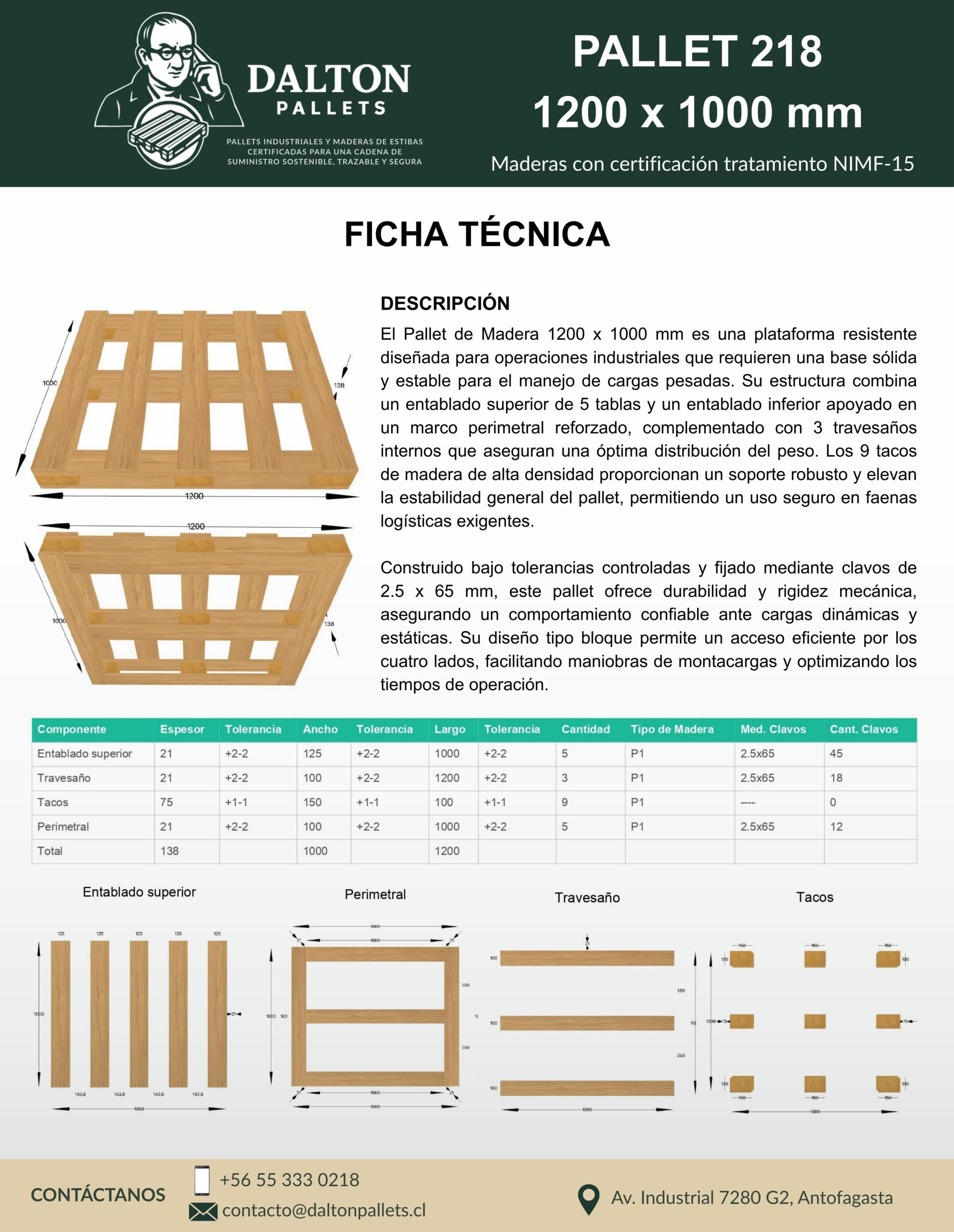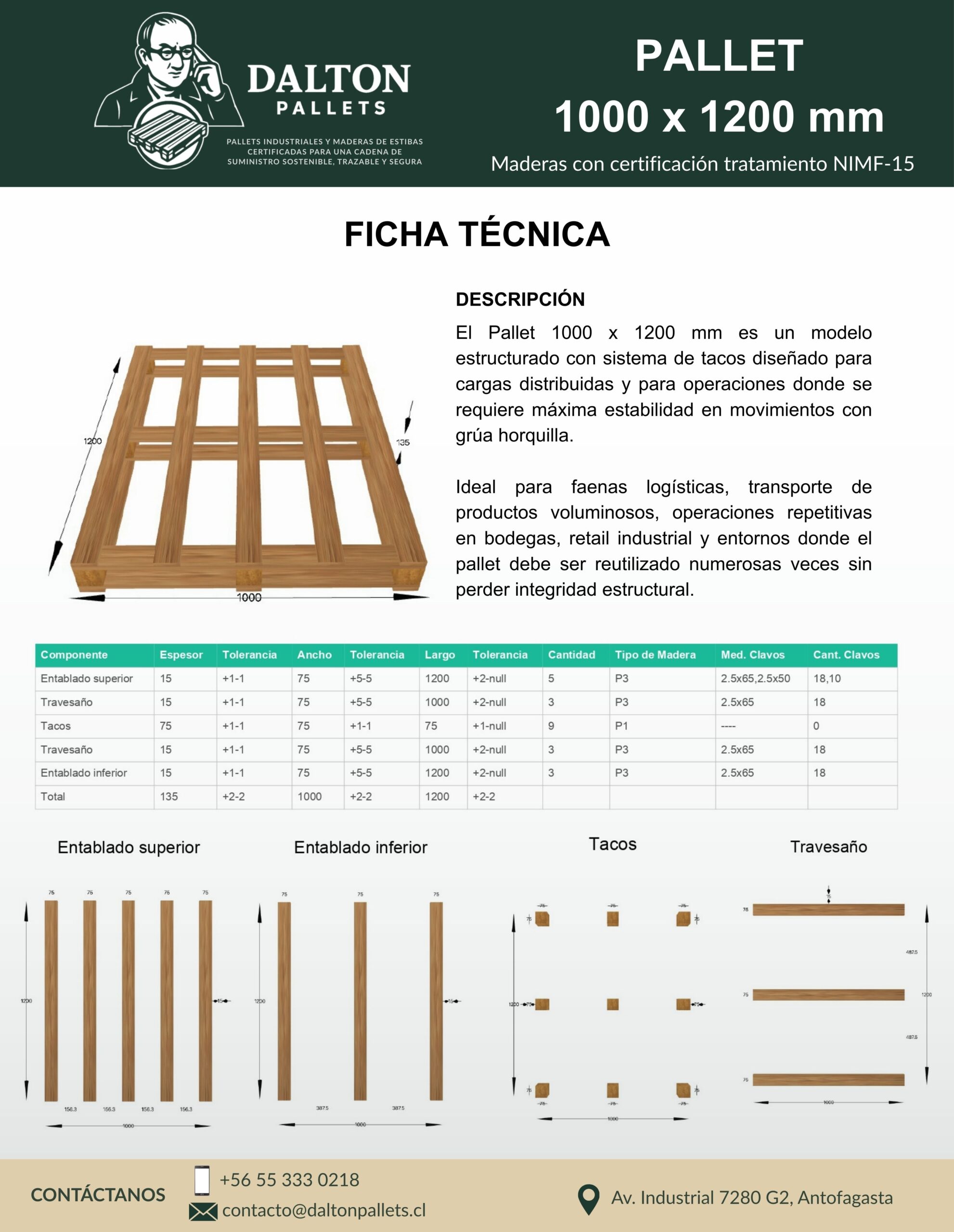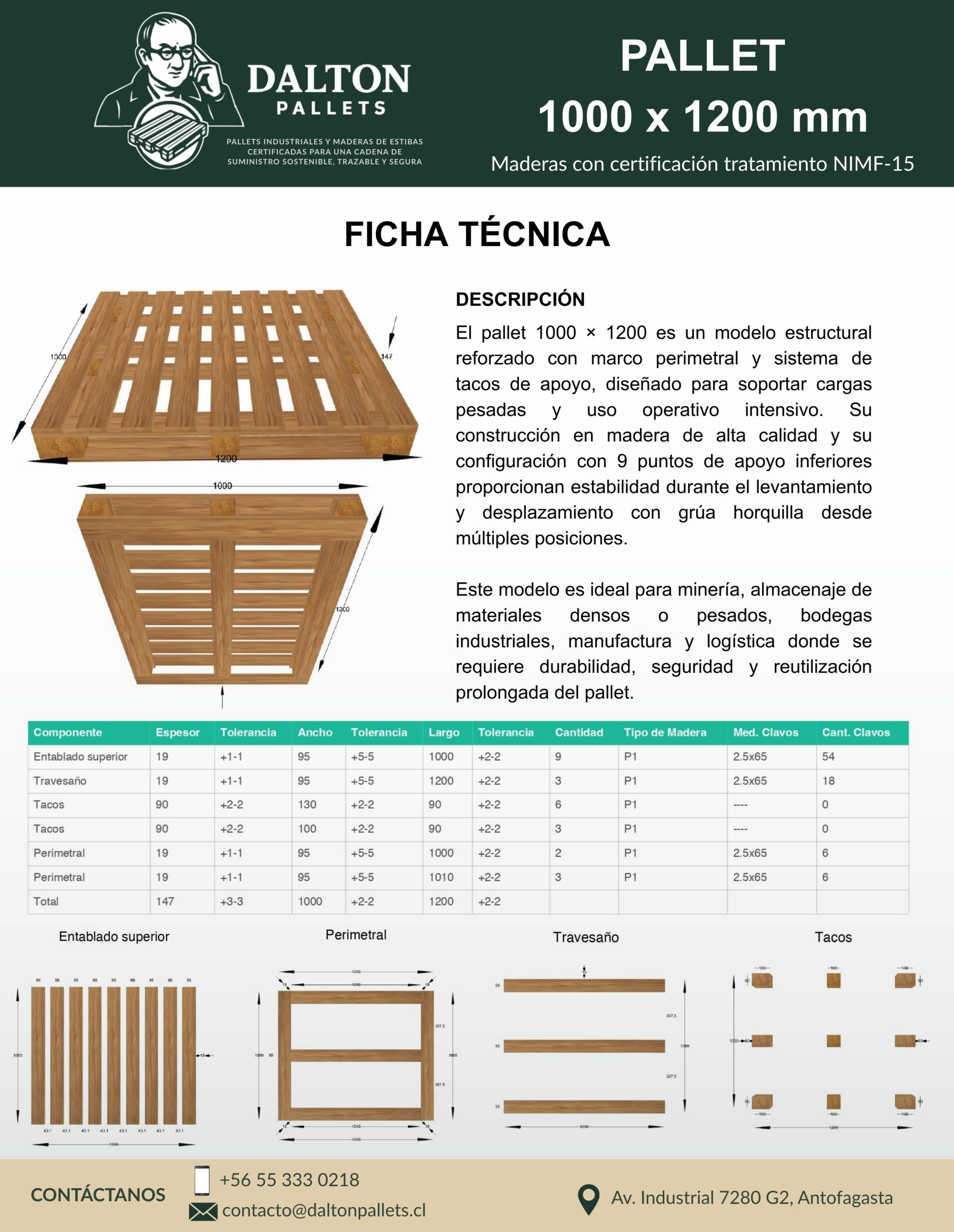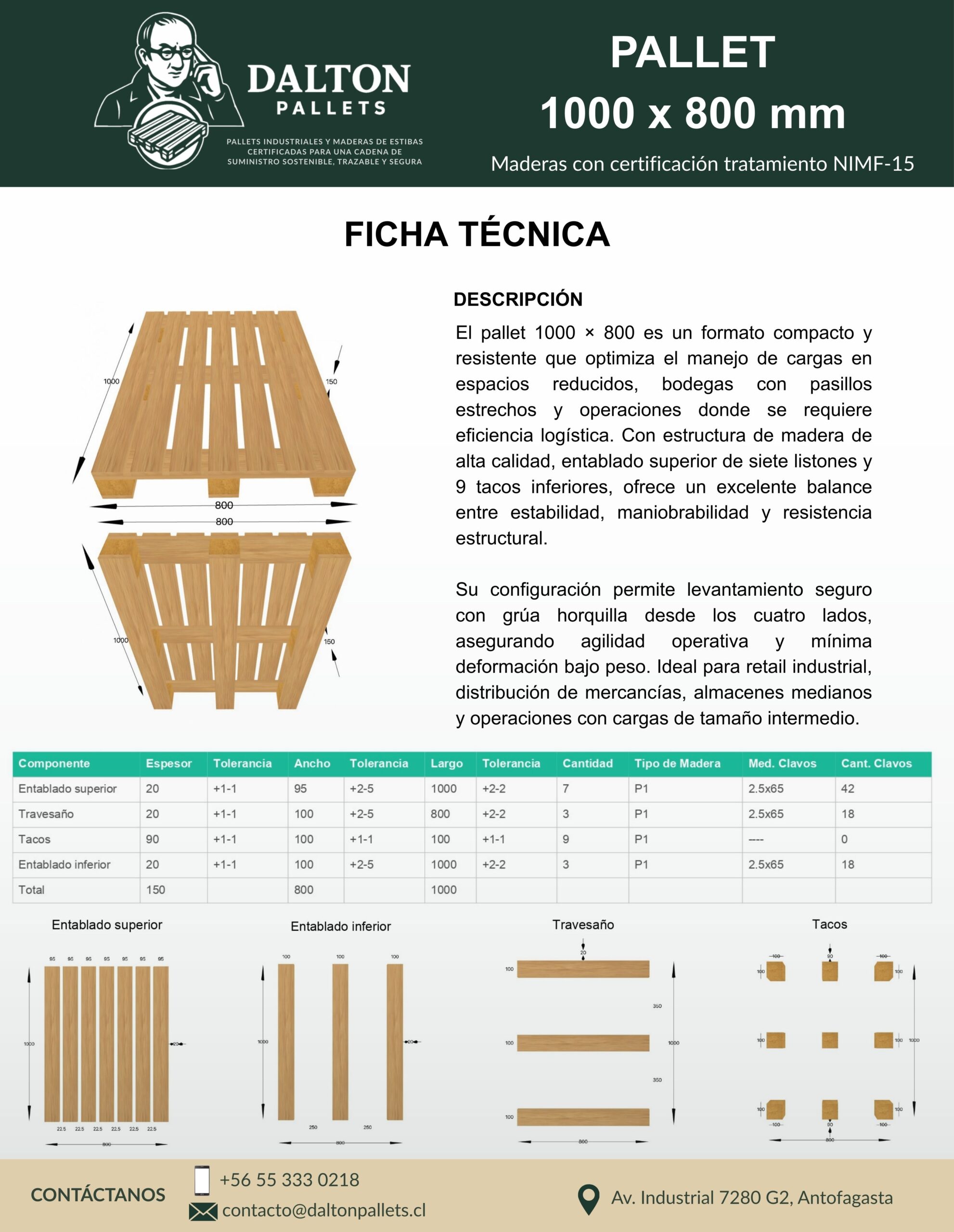 El Pallet 1000 x 1200 mm de está construido con una estructura sólida y equilibrada que incorpora 8 tablas en total, distribuidas en 5 tablas de entablado superior y 3 tablas de entablado inferior, junto con 6 travesaños (3 superiores y 3 inferiores) y 9 tacos, configuración que permite una correcta distribución de la carga, alta estabilidad estructural y una manipulación segura mediante grúa horquilla, incluso en operaciones logísticas intensivas y de uso repetitivo.
