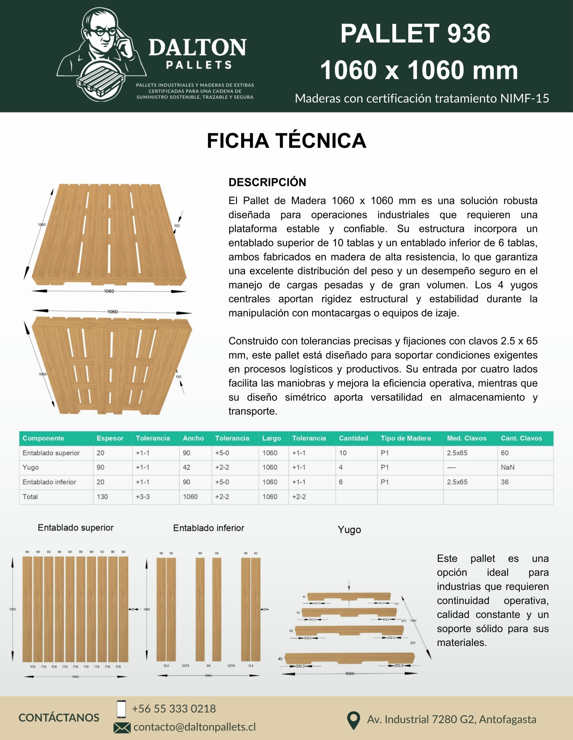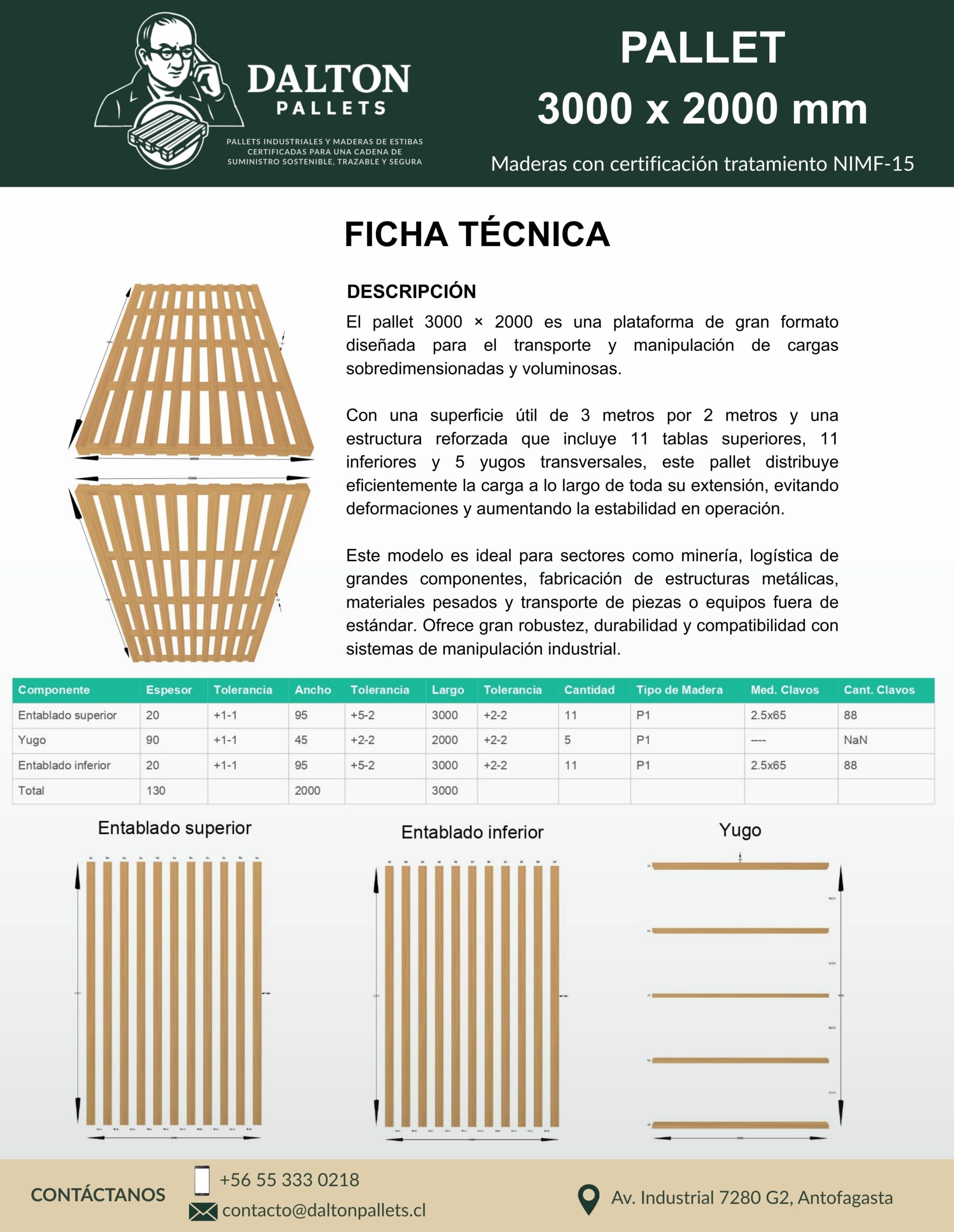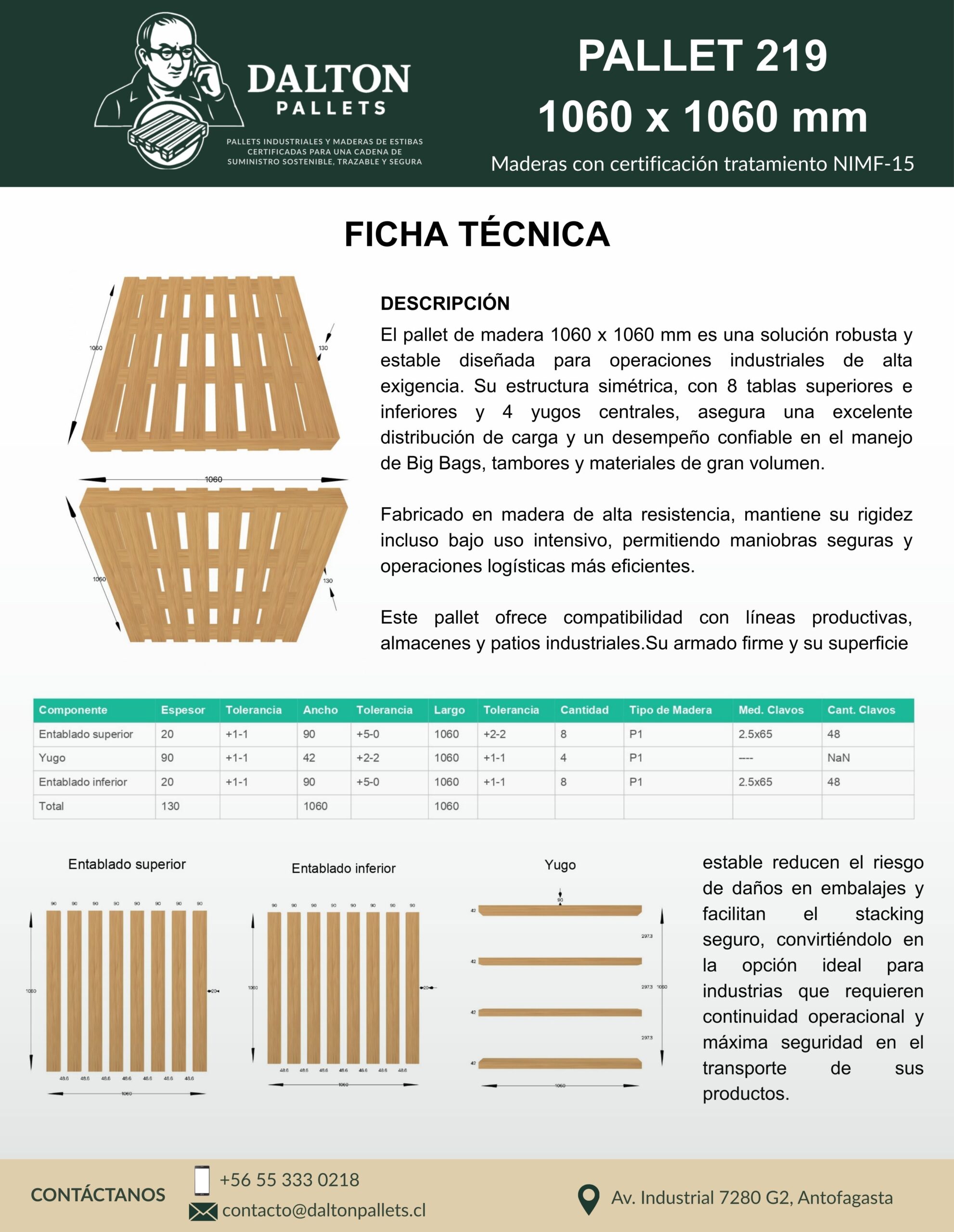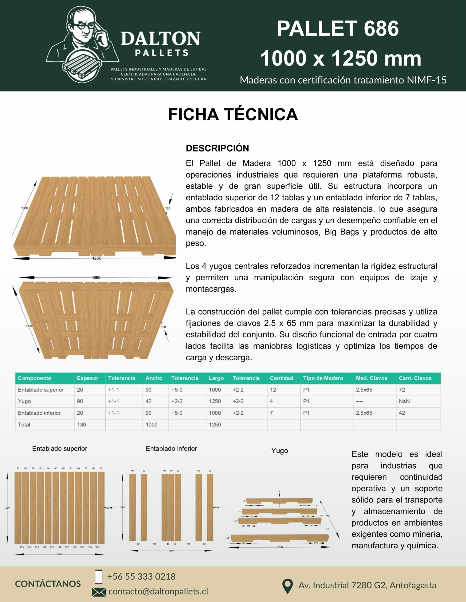 El Pallet 1000 x 1200 mm de está construido con una estructura sólida y equilibrada que incorpora 8 tablas en total, distribuidas en 5 tablas de entablado superior y 3 tablas de entablado inferior, junto con 6 travesaños (3 superiores y 3 inferiores) y 9 tacos, configuración que permite una correcta distribución de la carga, alta estabilidad estructural y una manipulación segura mediante grúa horquilla, incluso en operaciones logísticas intensivas y de uso repetitivo.