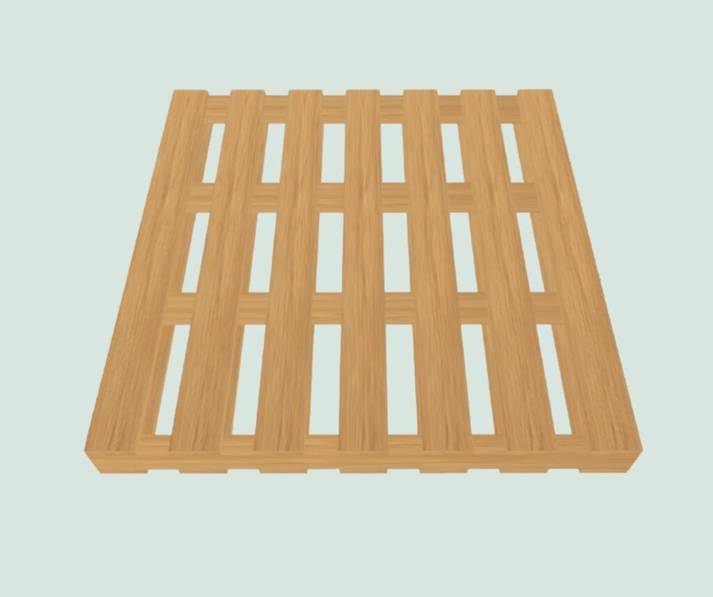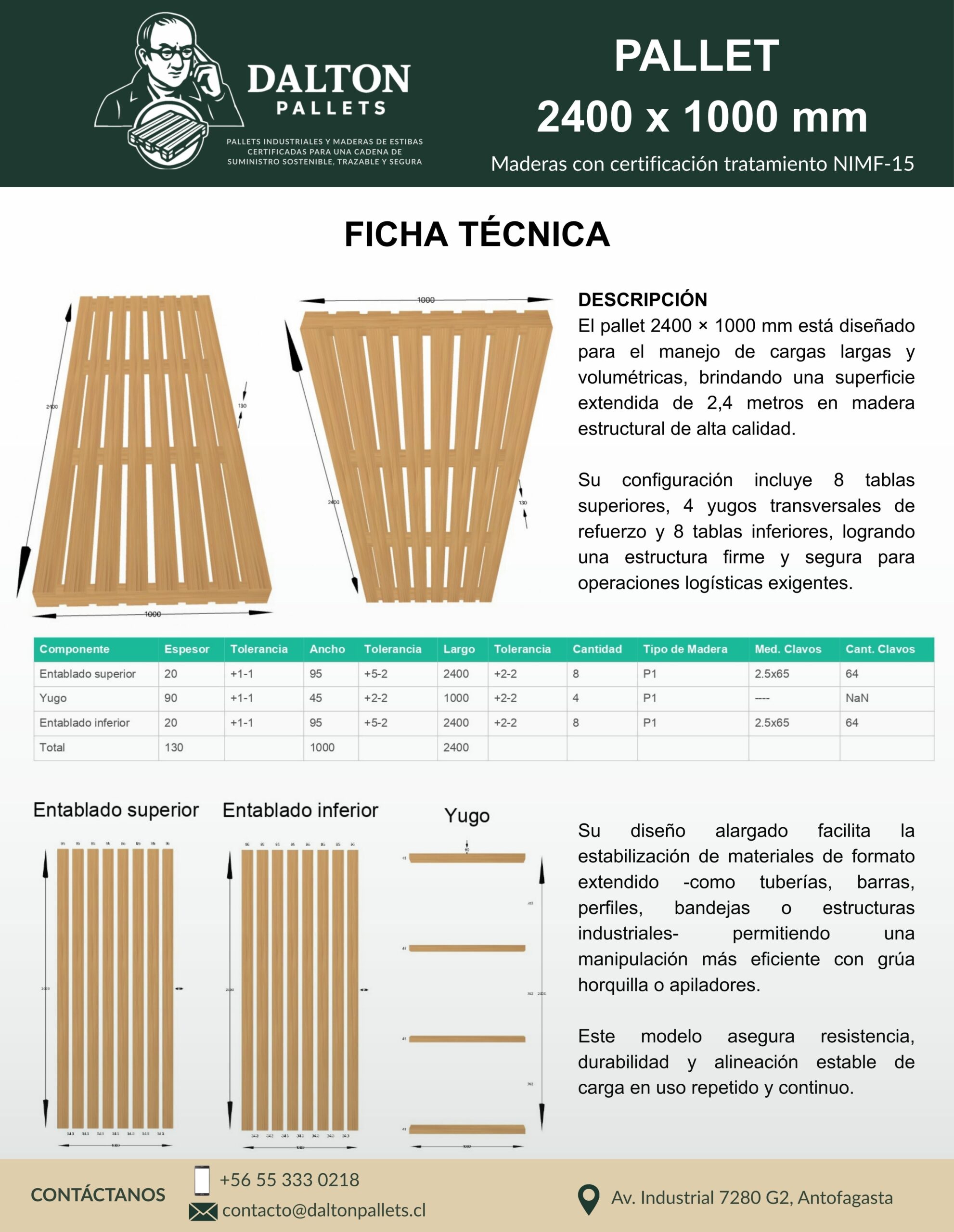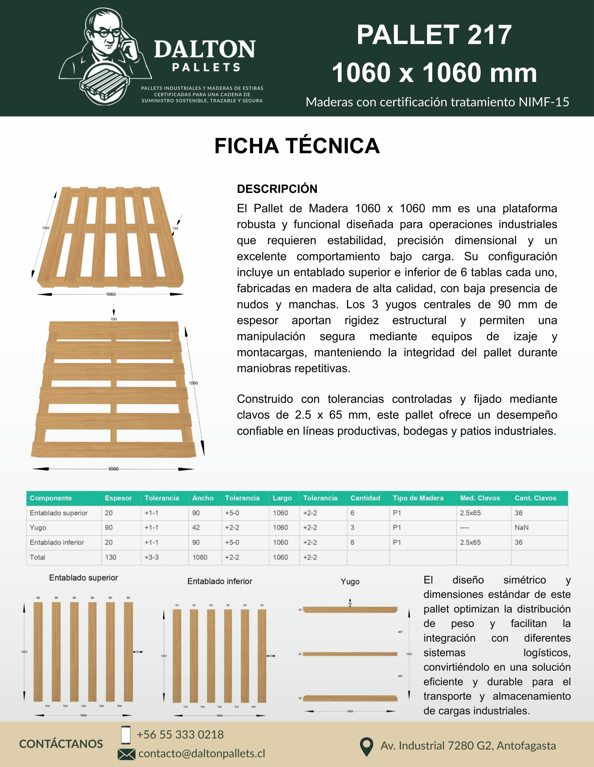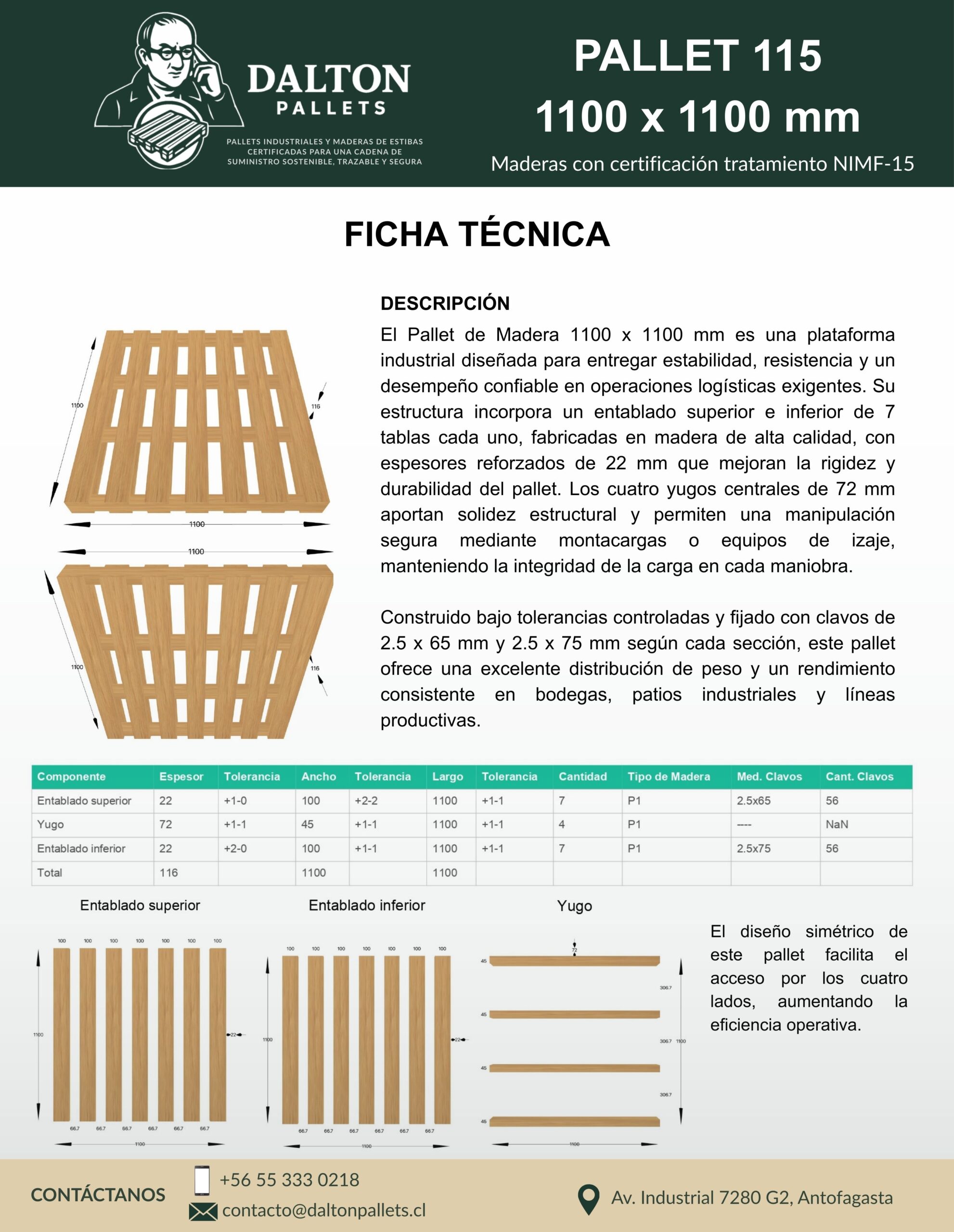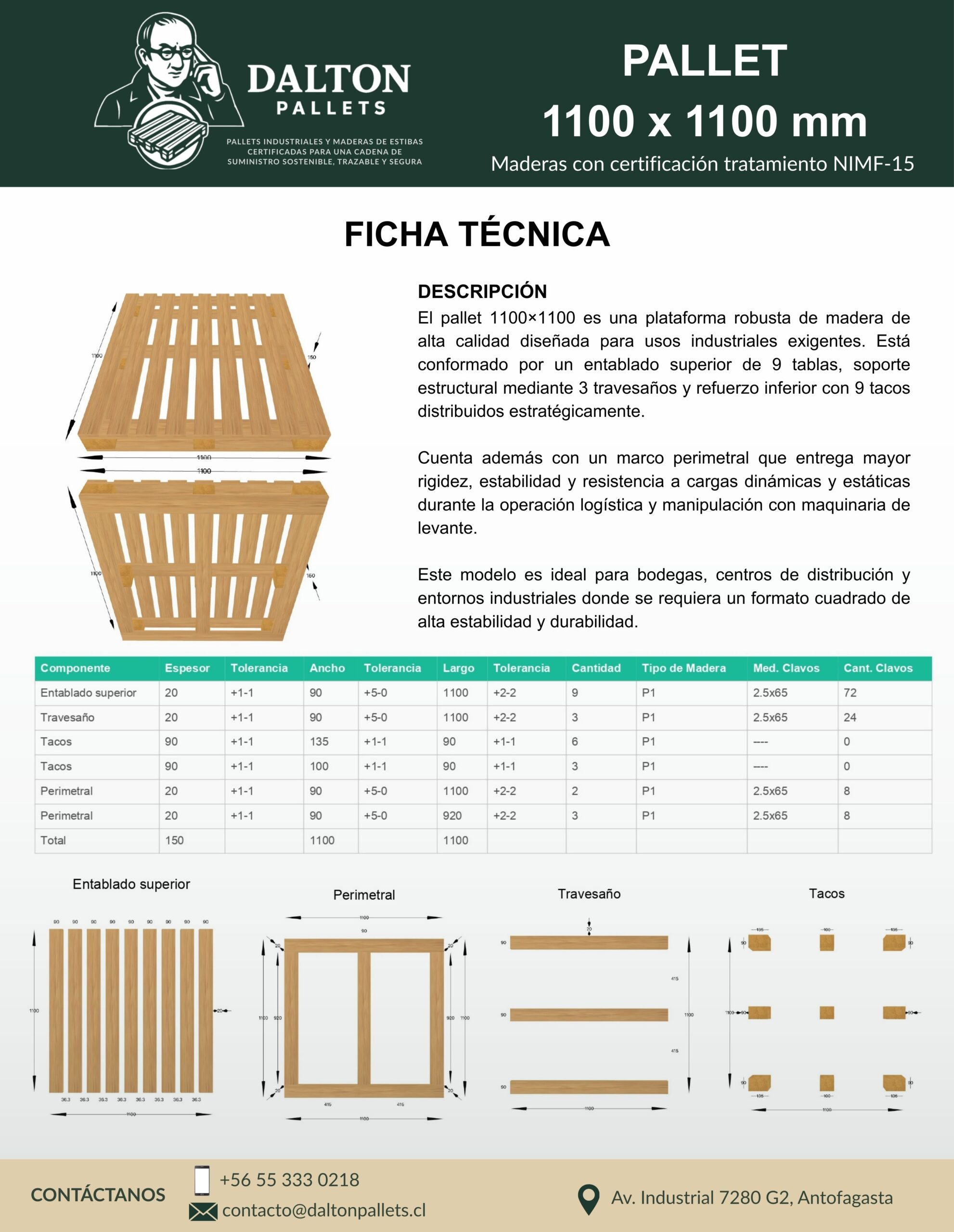 El Pallet 1000 x 1200 mm de está construido con una estructura sólida y equilibrada que incorpora 8 tablas en total, distribuidas en 5 tablas de entablado superior y 3 tablas de entablado inferior, junto con 6 travesaños (3 superiores y 3 inferiores) y 9 tacos, configuración que permite una correcta distribución de la carga, alta estabilidad estructural y una manipulación segura mediante grúa horquilla, incluso en operaciones logísticas intensivas y de uso repetitivo.